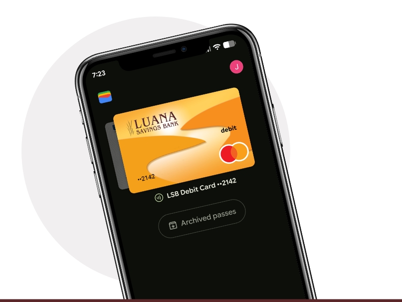 In your phone's wallet app, follow the on-screen instructions to add your Luana Savings Bank debit card.