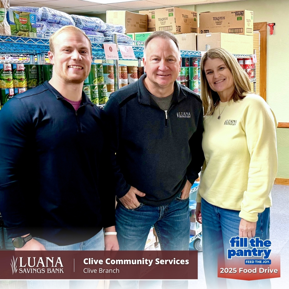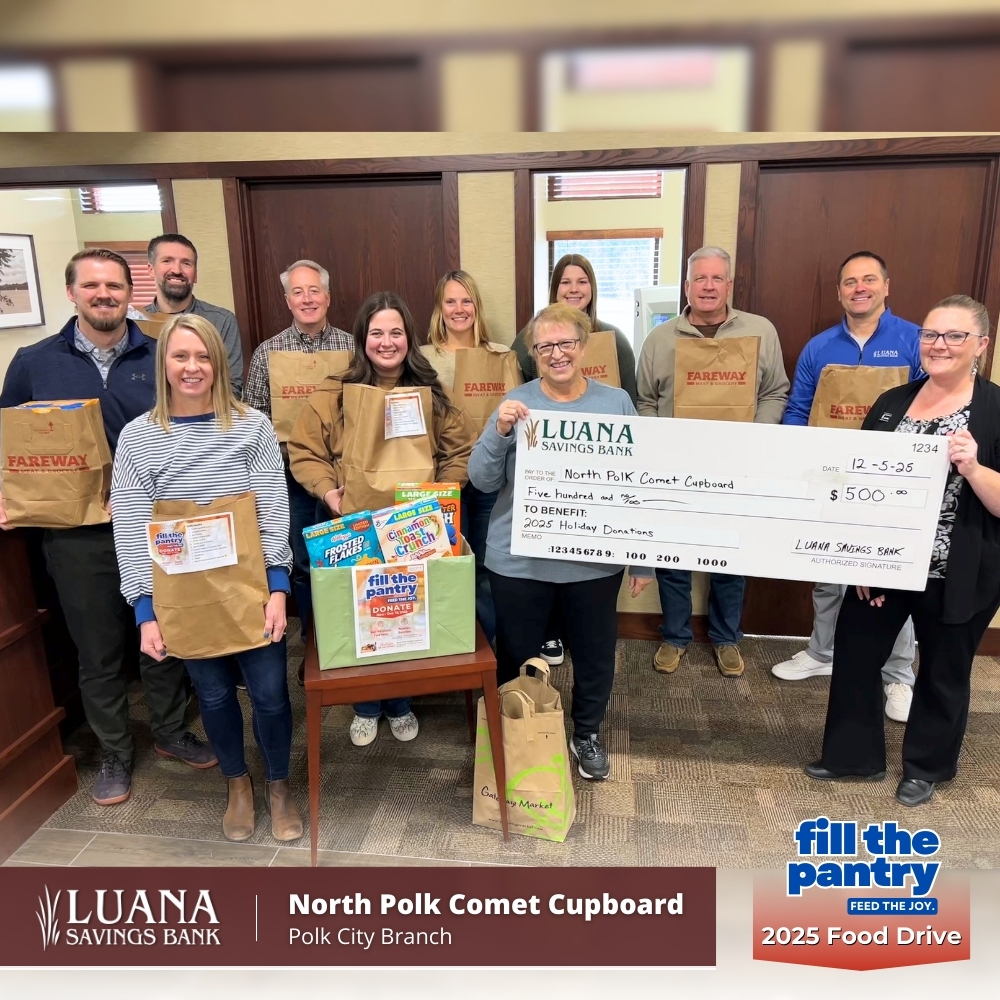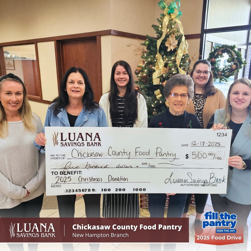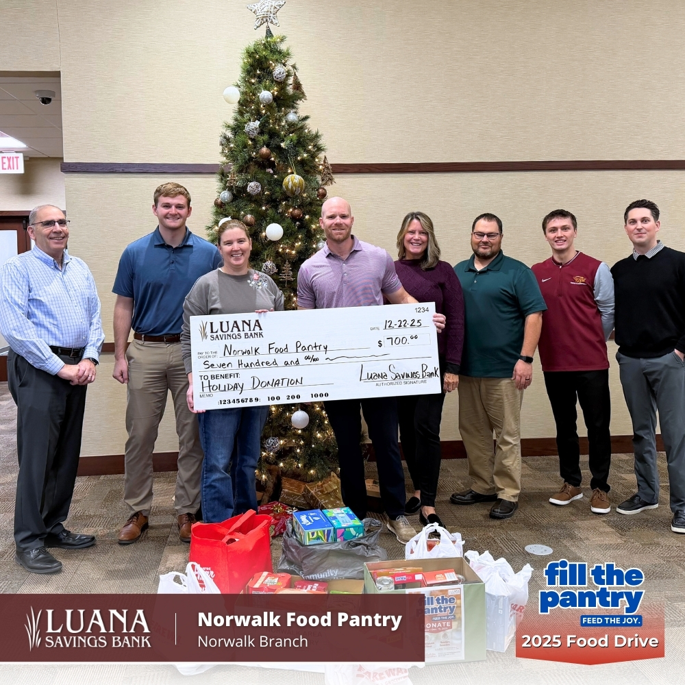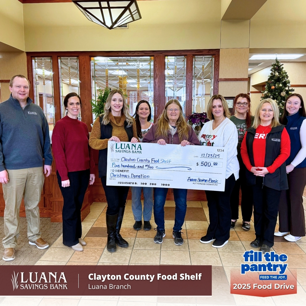 Luana Savings Bank is proud to have recently completed a coordinated community effort across all six of its branch locations (Luana, Ossian, New Hampton, Polk City, Clive, and Norwalk) to help with food insecurity efforts during the holiday season. Luana Savings Bank’s campaign was called “Fill the Pantry, Feed the Joy.” Throughout November and December 2025, each branch hosted a local food drive and offered matching funds for monetary donations up to $500 per branch to help support families in need within our local communities.