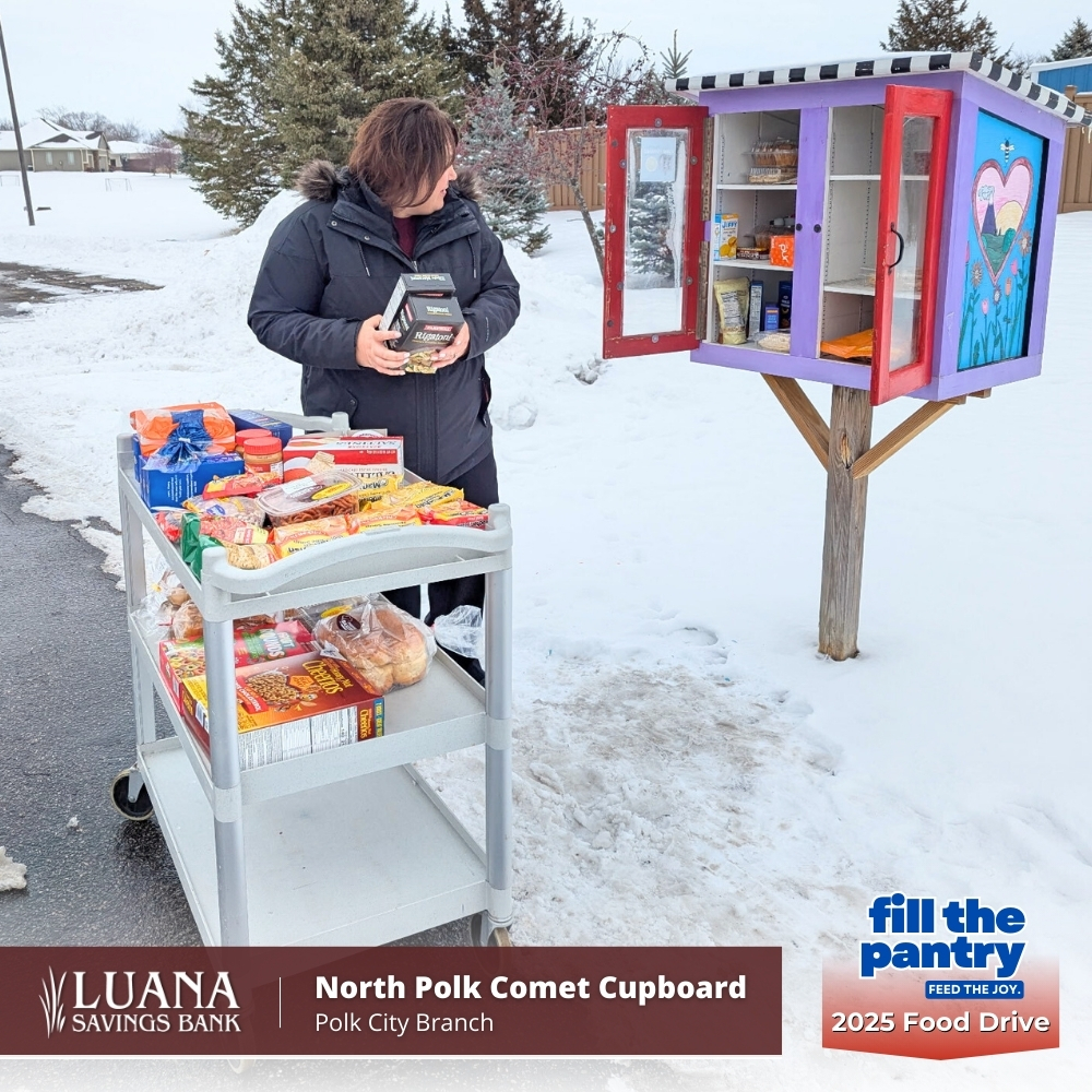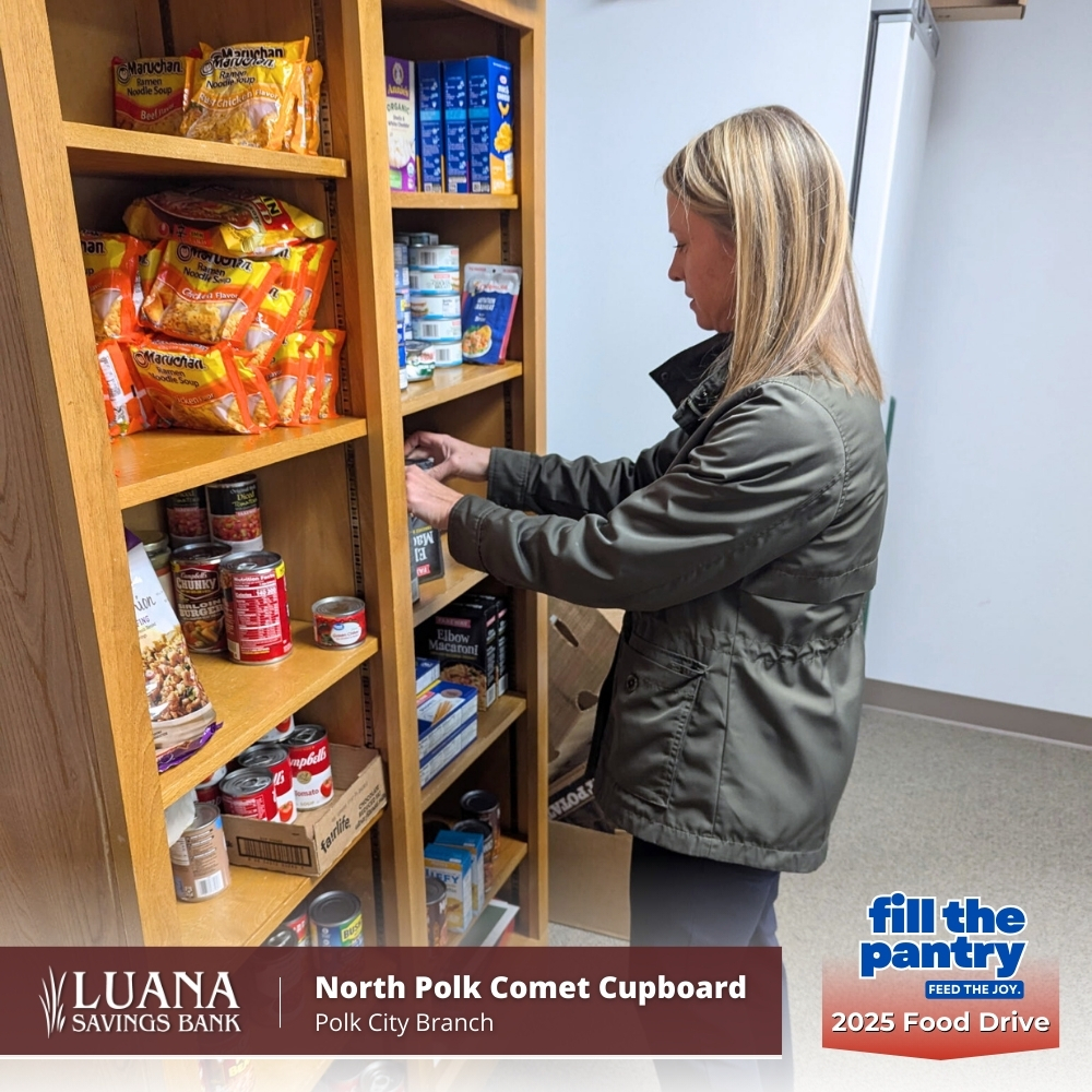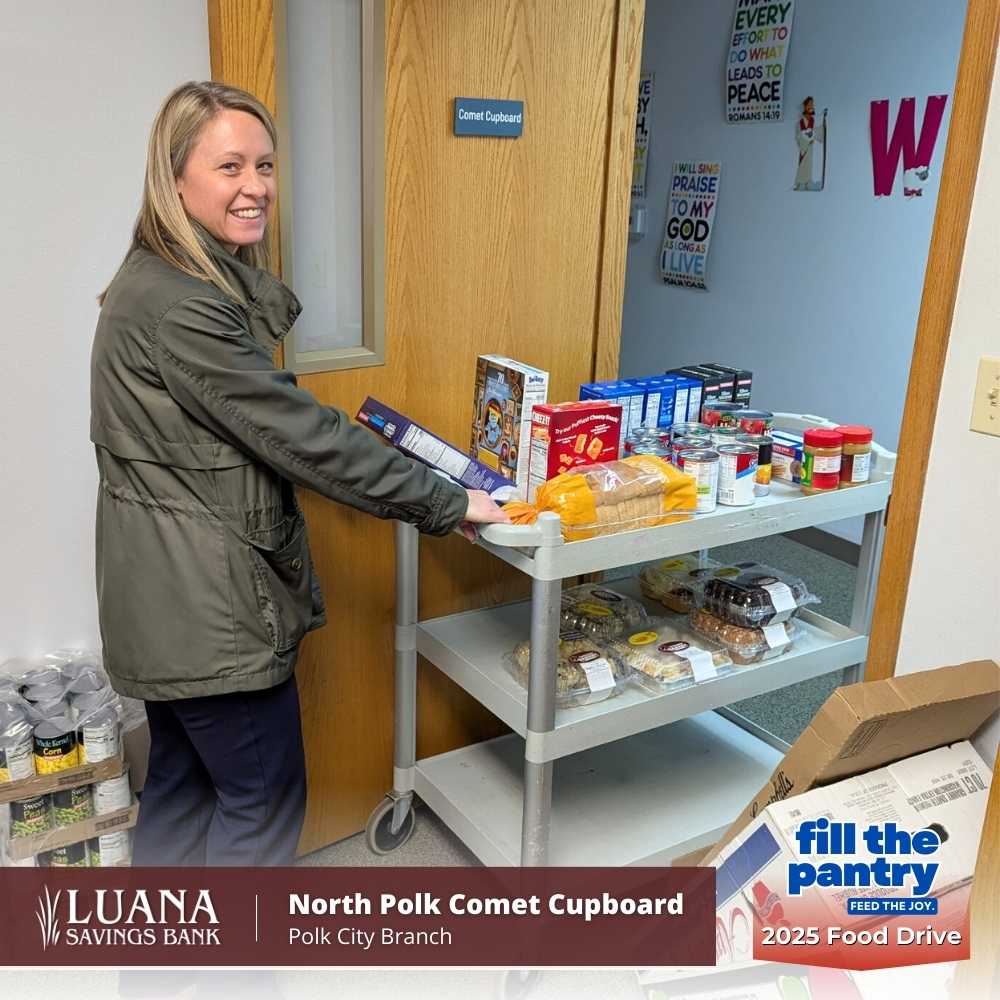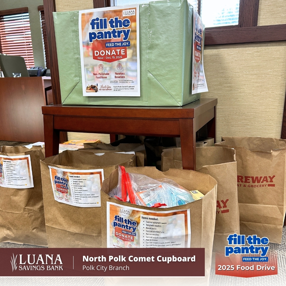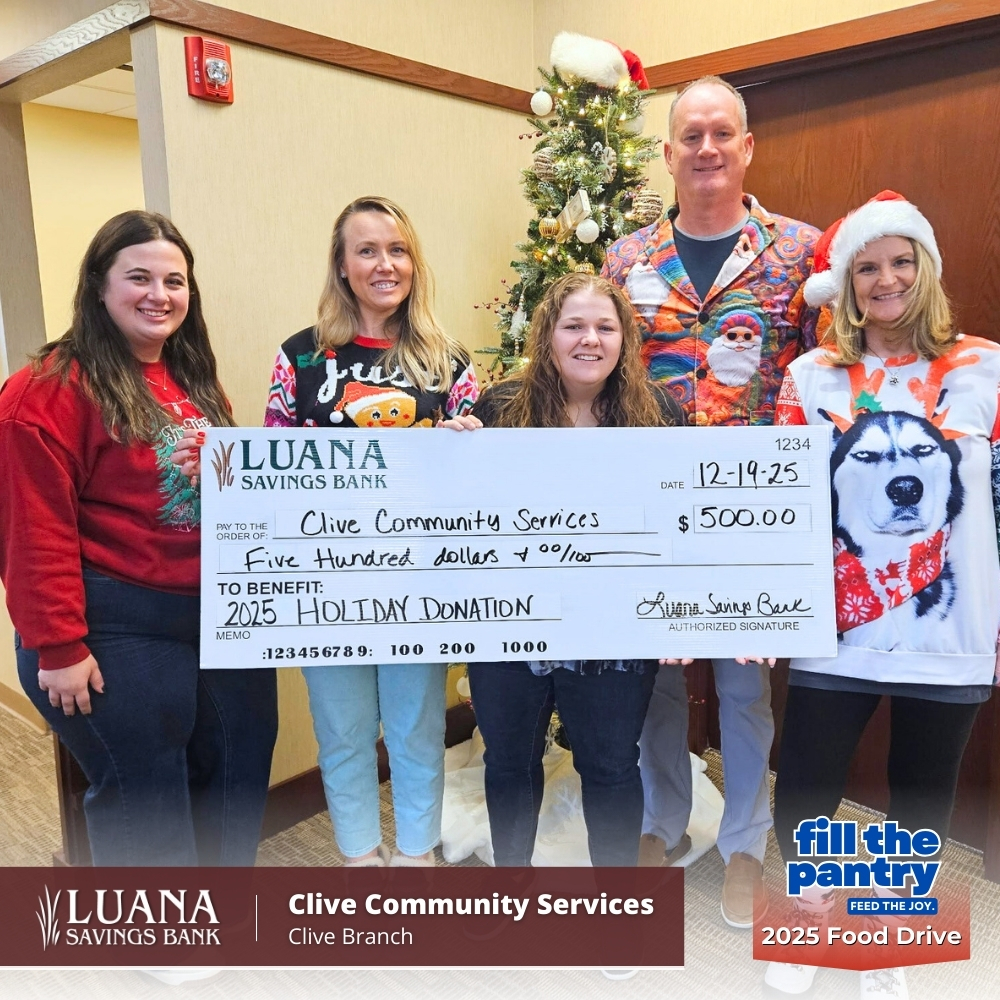 Luana Savings Bank is proud to have recently completed a coordinated community effort across all six of its branch locations (Luana, Ossian, New Hampton, Polk City, Clive, and Norwalk) to help with food insecurity efforts during the holiday season. Luana Savings Bank’s campaign was called “Fill the Pantry, Feed the Joy.” Throughout November and December 2025, each branch hosted a local food drive and offered matching funds for monetary donations up to $500 per branch to help support families in need within our local communities.